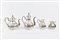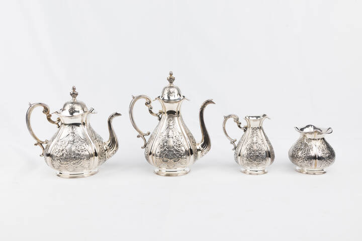 composto da: caffettiera, teiera , lattiera e zuccheriera; interamente sbalzati a motivi floreali e vegetali. Prese geometriche