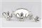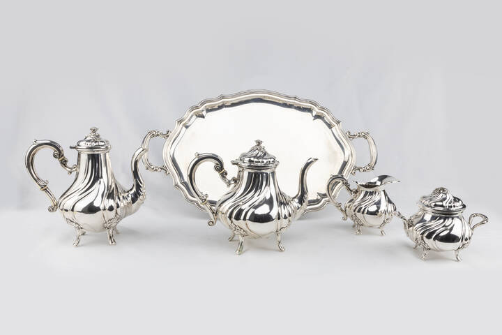 teiera, caffettiera, zuccheriera, lattiera e vassoio. Corpi bombati e lavorati a torchon; prese a forma di fiore (una presa da saldare). Manici a volute.