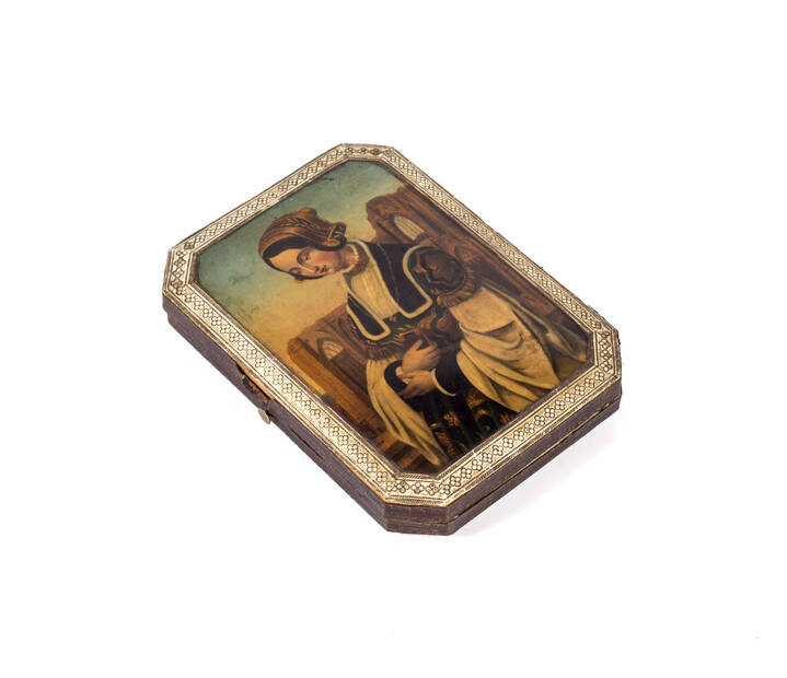 XIX secolo, in legno dipinto con donna in costume. Sttrumenti per il cucito in argento.