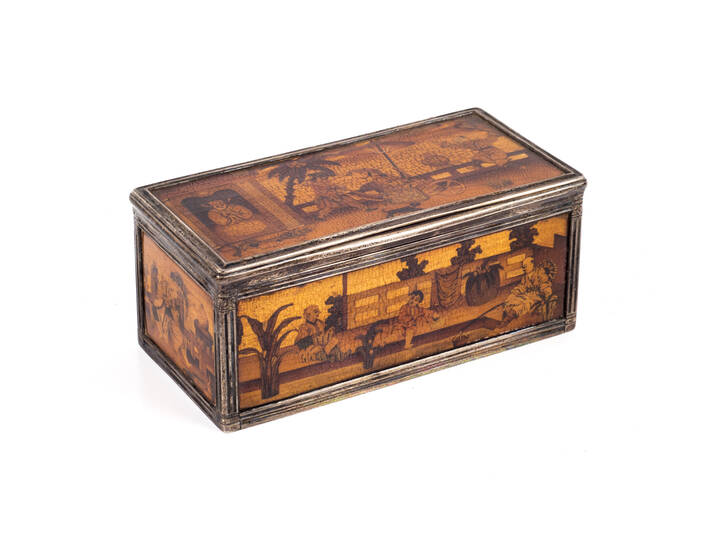 Di forma rettangolare, decorata con lati in legno dipinto a scene orientali. Interno dorato. Reca punzoni francesi.