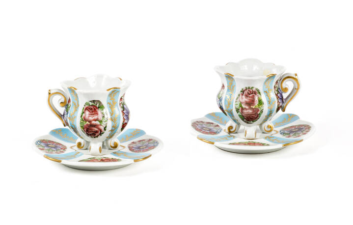 In porcellana di Sevres, marcate sotto la base, con piattini. Decorazioni con motivi floreali