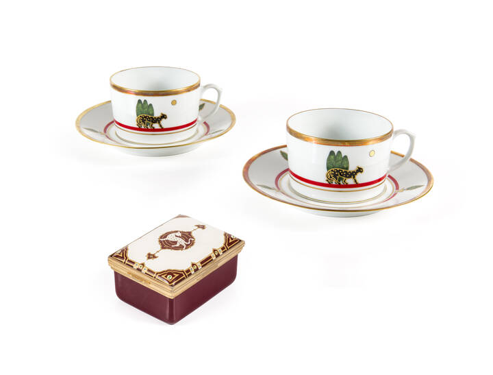 - coppia di tazze da thè con piattini in ceramica di Limoges, firmati "Cartier", serie "La Maison de Louis Cartier", decorate con alberi e pantere. Anno 1986