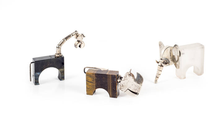 Firmati "Modena", a forma di giraffa, elefante e rinoceronte. Corpi in vetro e marmo (rotture, difetti e restauri). Teste snodate e code in argento