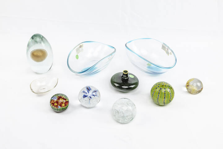 -sei fermacarte di forma rotonda ed a uovo con murrine e decori vari.