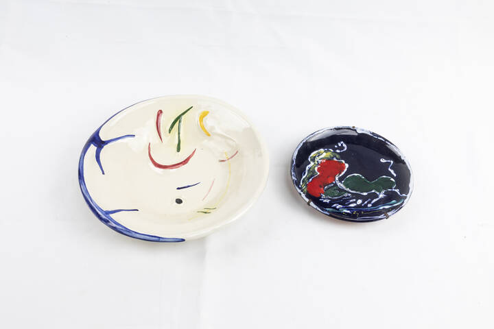 in ceramica policroma: uno firmato "Salvatore Campagna, eseguito nel laboratorio Rosmar Ceramiche di Dolcedo, raffigurante un vlto astratto; esemplare 32/300 eseguito nel 1991, Diam. 27; l'altro eseguito da Umberto Ghersi, raffigurante un torero con toro. Diam.18 cm