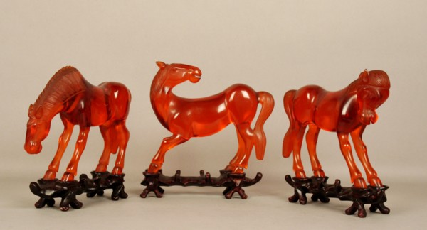 Firmato. Tre sculture in resina naturale raff. ''CAVALLI''. Cina. XX secolo....