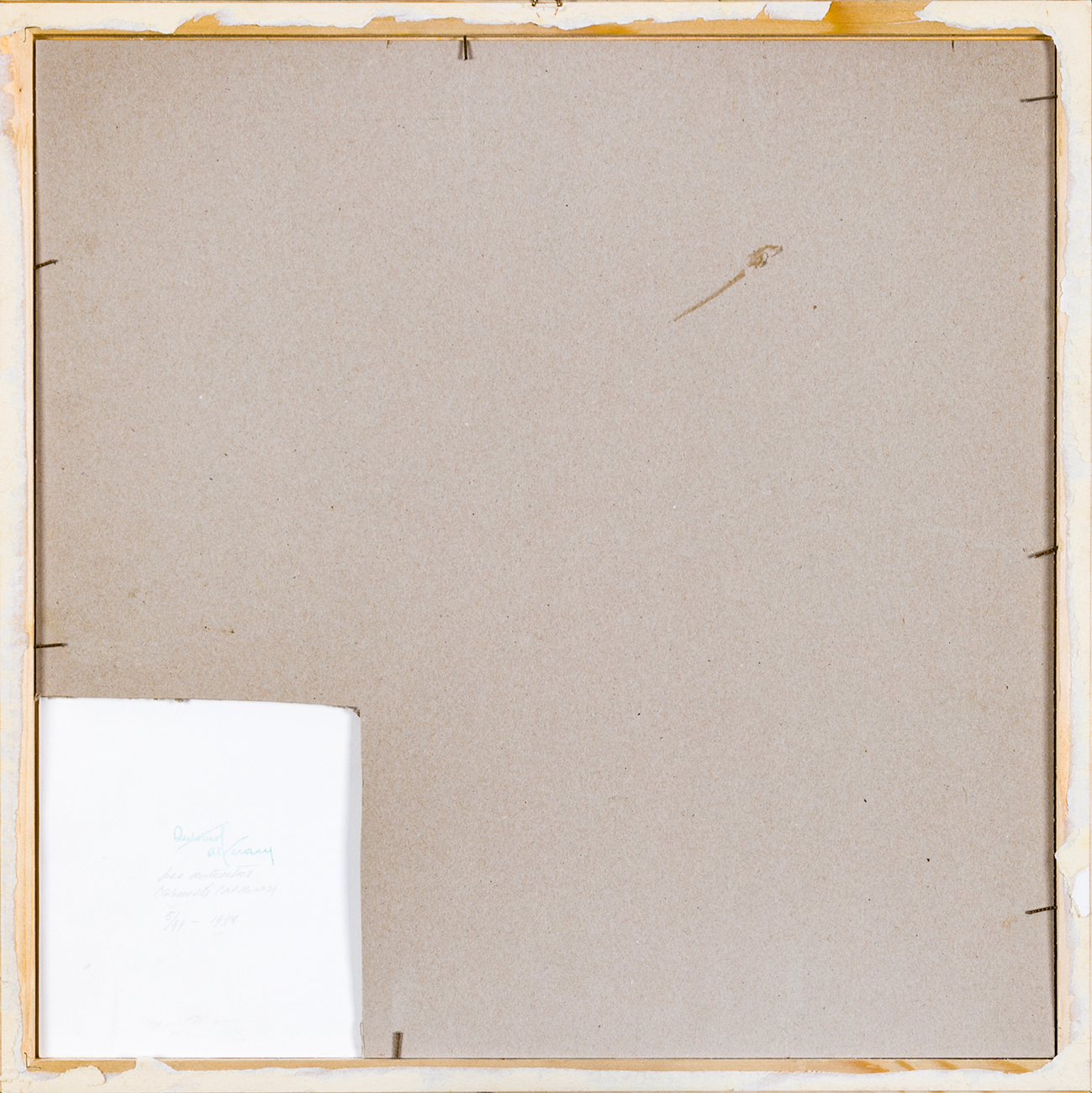 Timbro dell'Artista, datazione, dichiarazione di autenticità a cura di Carmela Calderara e numerazione (Esemplare 5/99) al retro