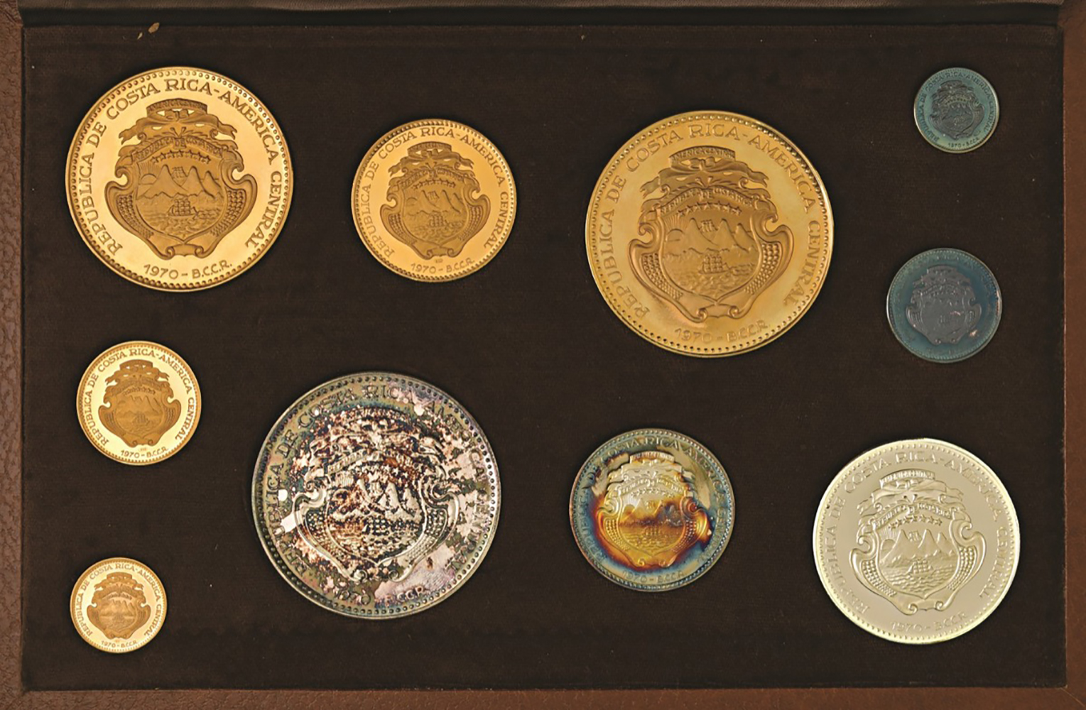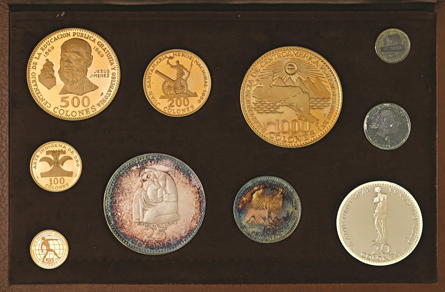 Serie 1970, 5 valori in ORO (2.000, 1.000, 200, 100 e 50 colones) e 5 in argento (25, 20, 10, 5 e 2