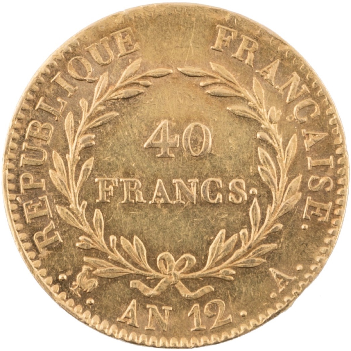 40 franchi anno 12, Parigi. Gadoury 1080. ORO, gr. 12,88. Lieve colpetto sul ciglio del bordo. Esemplare di notevole bellezza. SPL