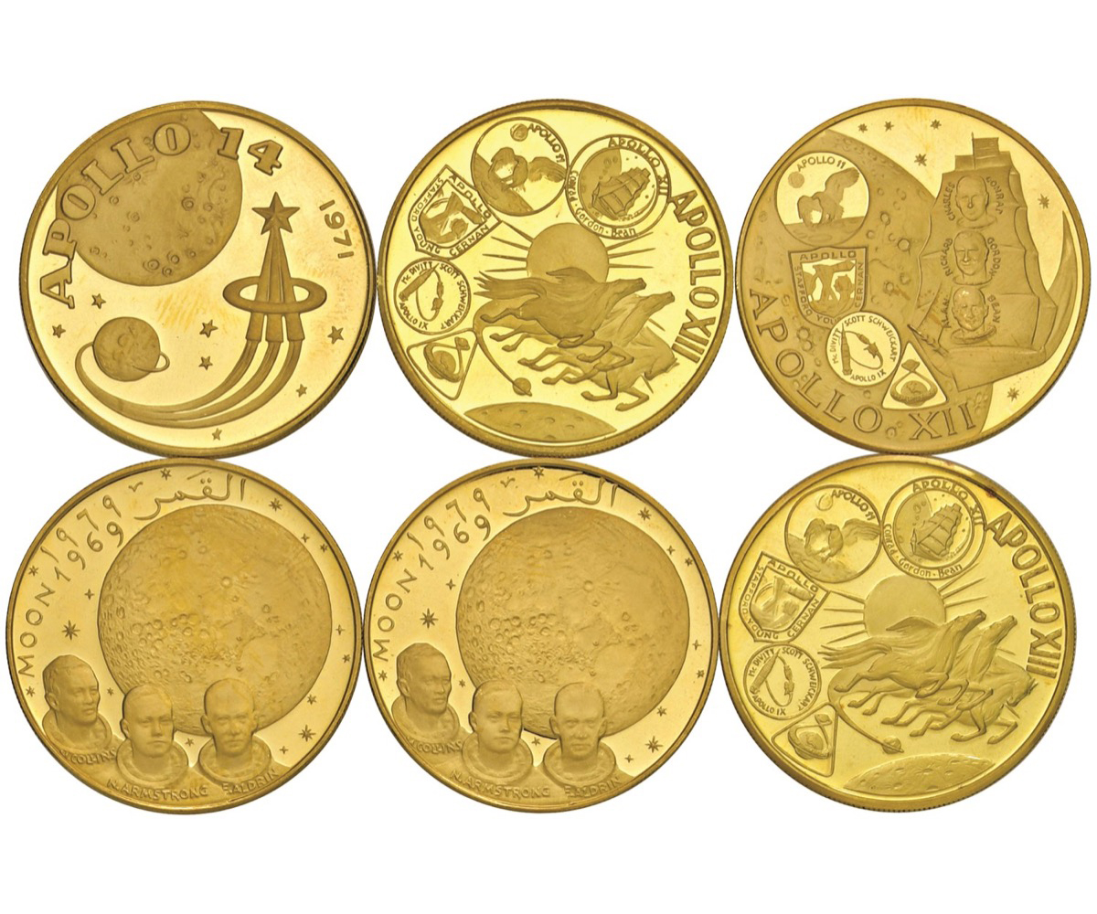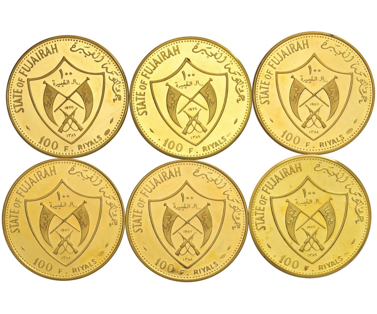 Lotto di 6 monete da 100 F. riyals 1969 e 1970. ORO, gr. 123,84. FDC