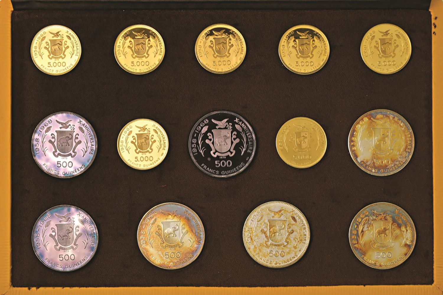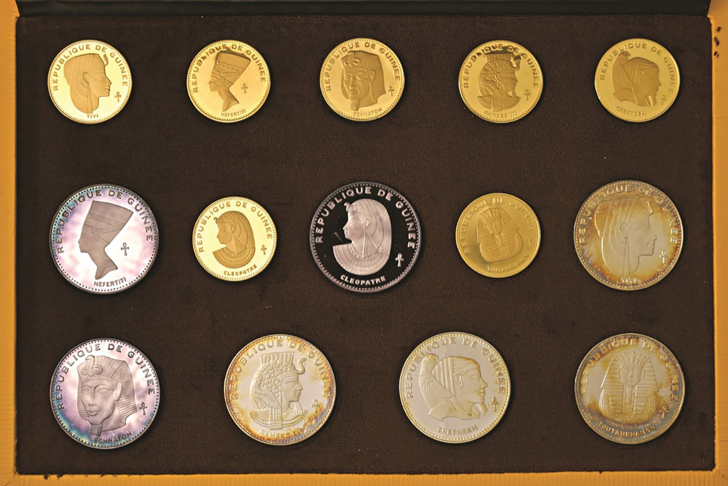 Serie 1970 Antico Egitto, 7 monete da 5.000 francs guineens in ORO, e 7 monete da 500 francs