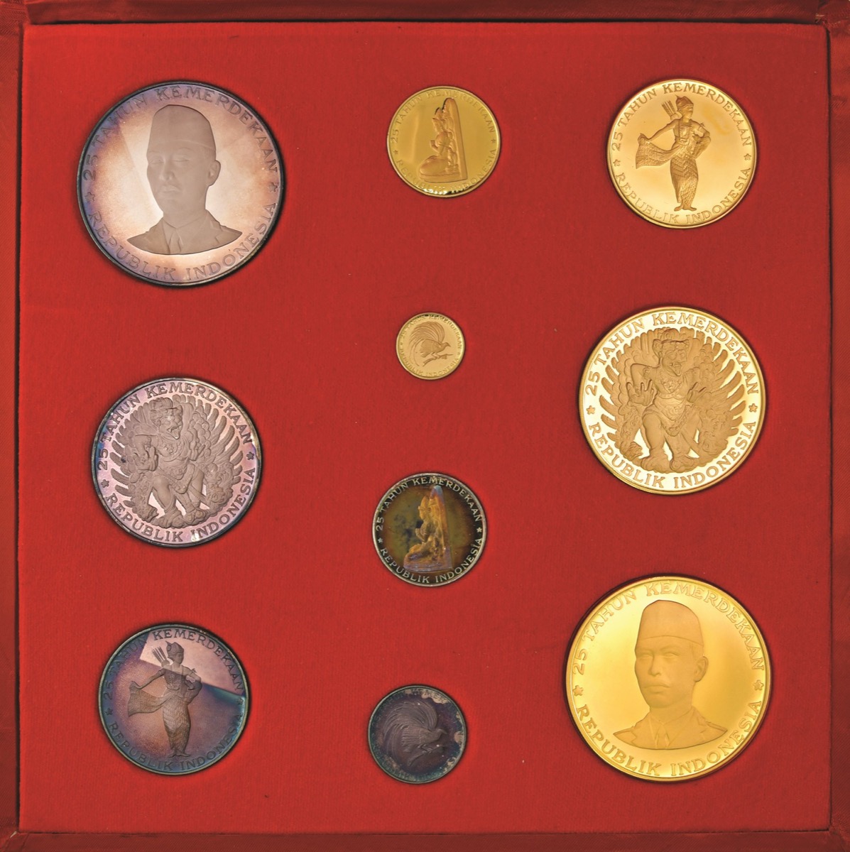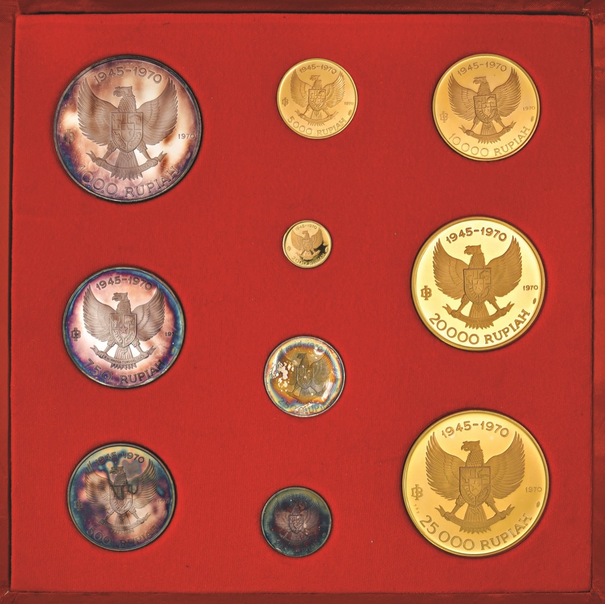 Serie 1970, 5 valori in ORO (25.000, 20.000, 10.000, 5.000 e 2.000 rupiah) e 5 in argento (1.000,