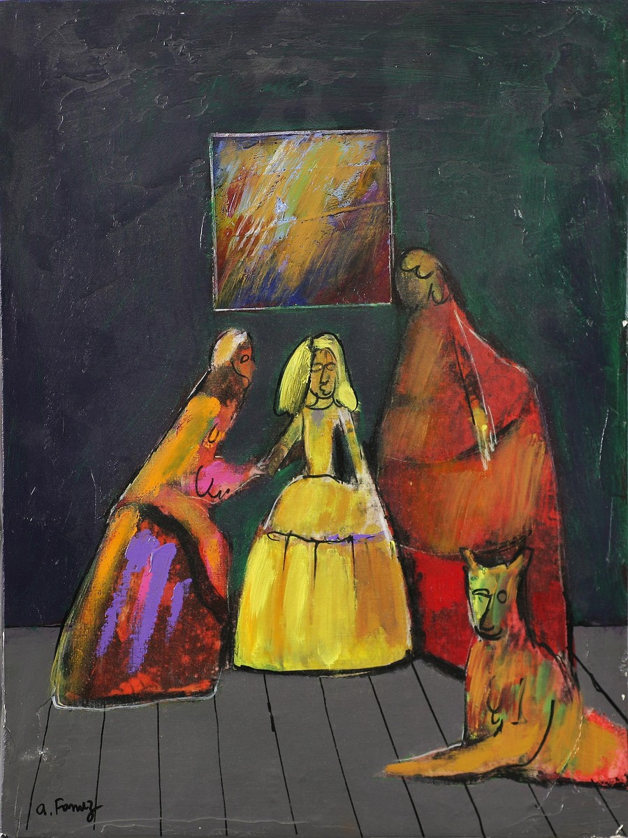 FOMEZ ANTONIO (n. 1937) Da Velazquez. Olio su tela . Cm 30,00 x 40,00. Firma in basso a sinistra. Al retro dedica.