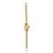cassa rotonda, quadrante chiaro con indici e numeri arabi in smalto nero, secondi al sei, movimento a carica manuale, bracciale elasticizzato.