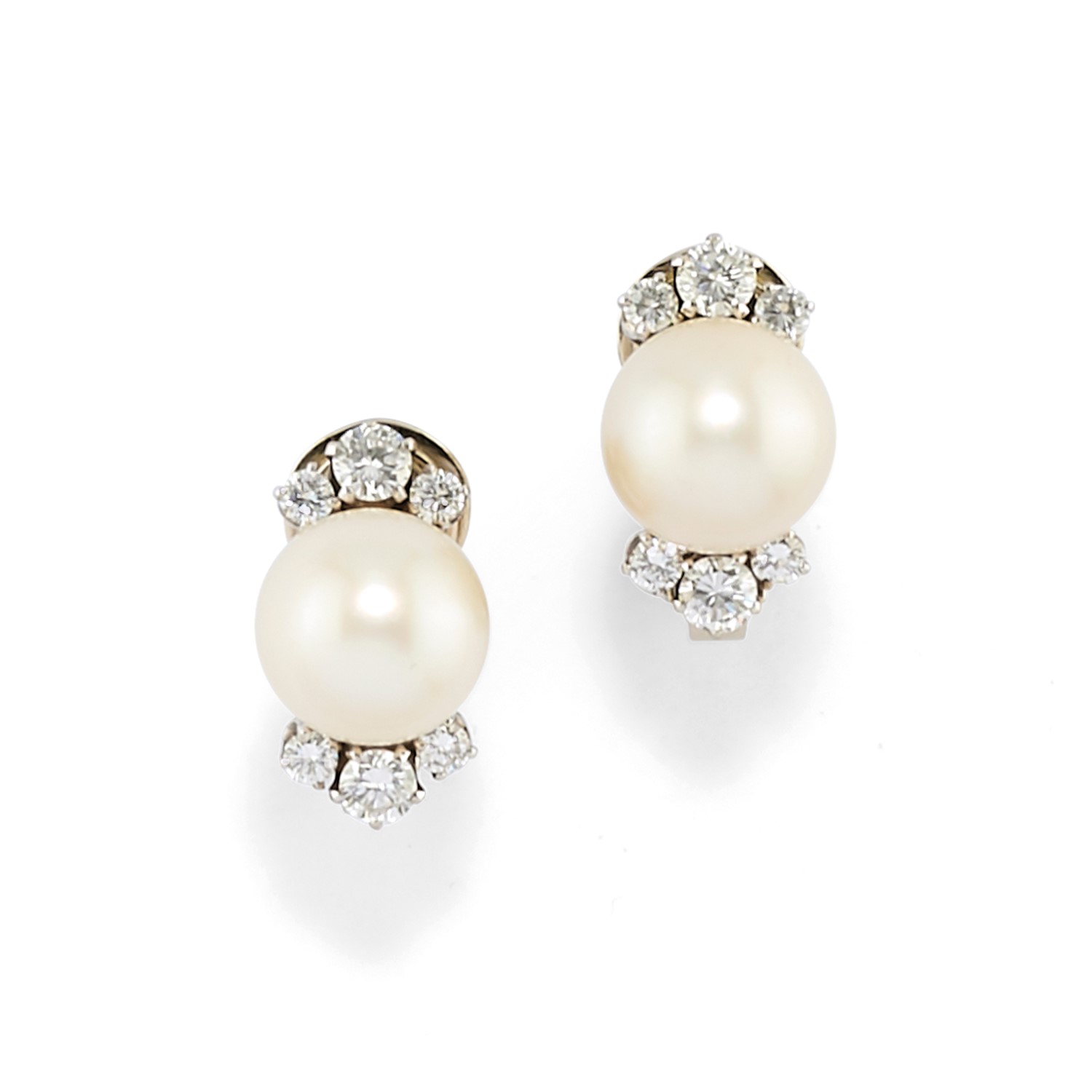 in oro bianco 18K, perle coltivate di mm 9,50 e diamanti taglio brillante per totale ct 0,80 circa.