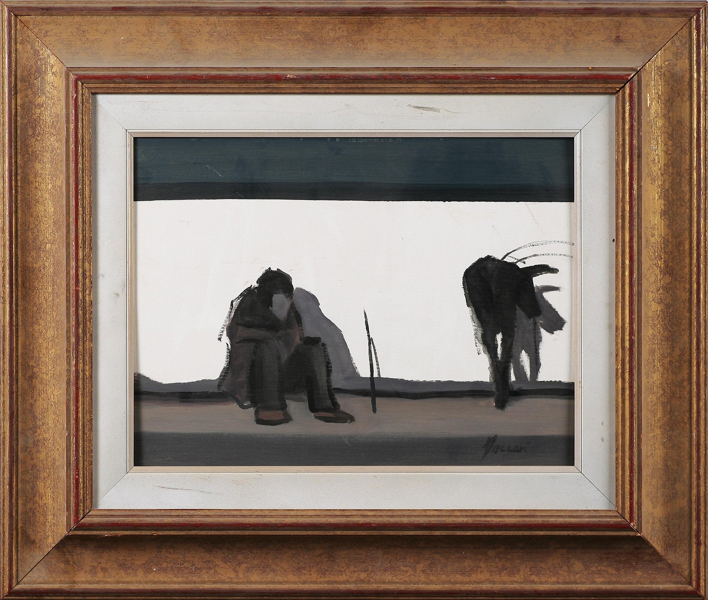 NACCARI ROBERTO (n. 1935) Siesta. 1971. Olio su cartone telato. Cm 40,00 x 30,00. Al retro cartiglio descrittivo della Galleria Libreria R. Ghelfi di Orvieto e Cattolica. Firma in basso a destra. Cornice presente