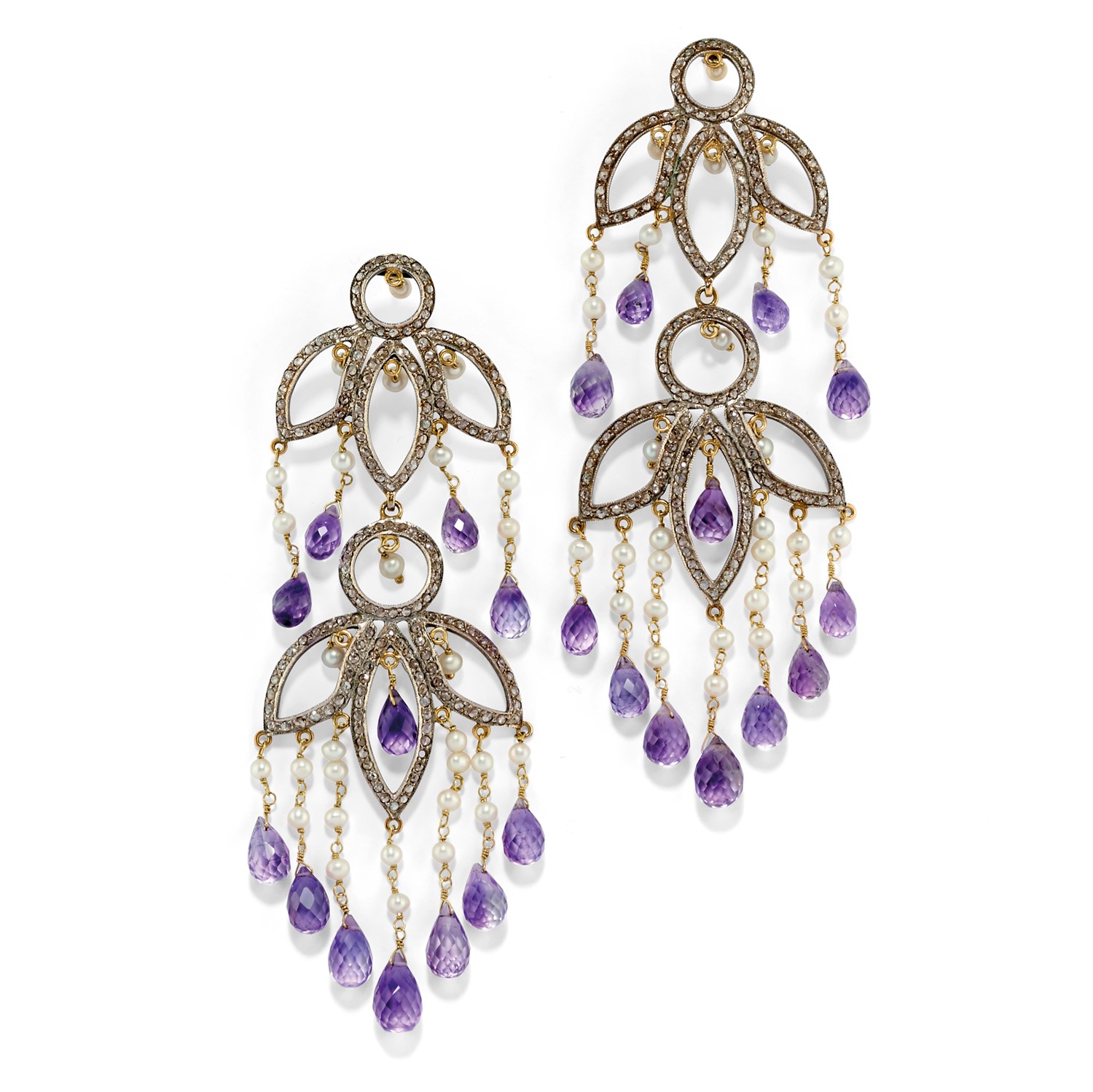 Orecchini pendenti con ametiste, perle coltivate e diamanti