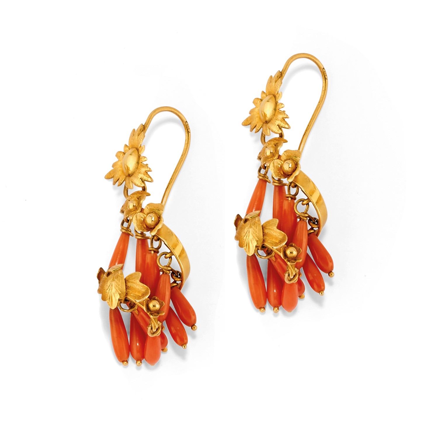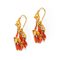in oro giallo 10K, con motivi a fiore e gocce di corallo su perno oscillante.