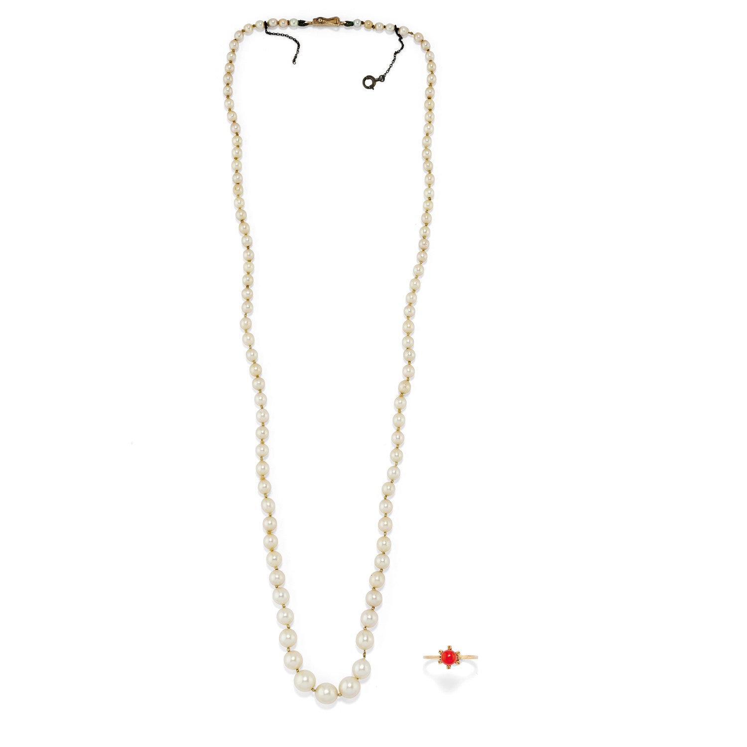 in argento e oro giallo 18K, composto da collana con perle coltivate e anello con centrale in corallo.