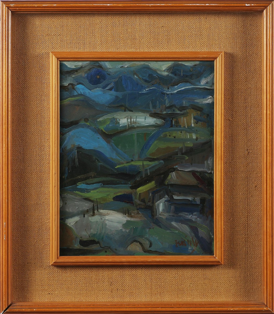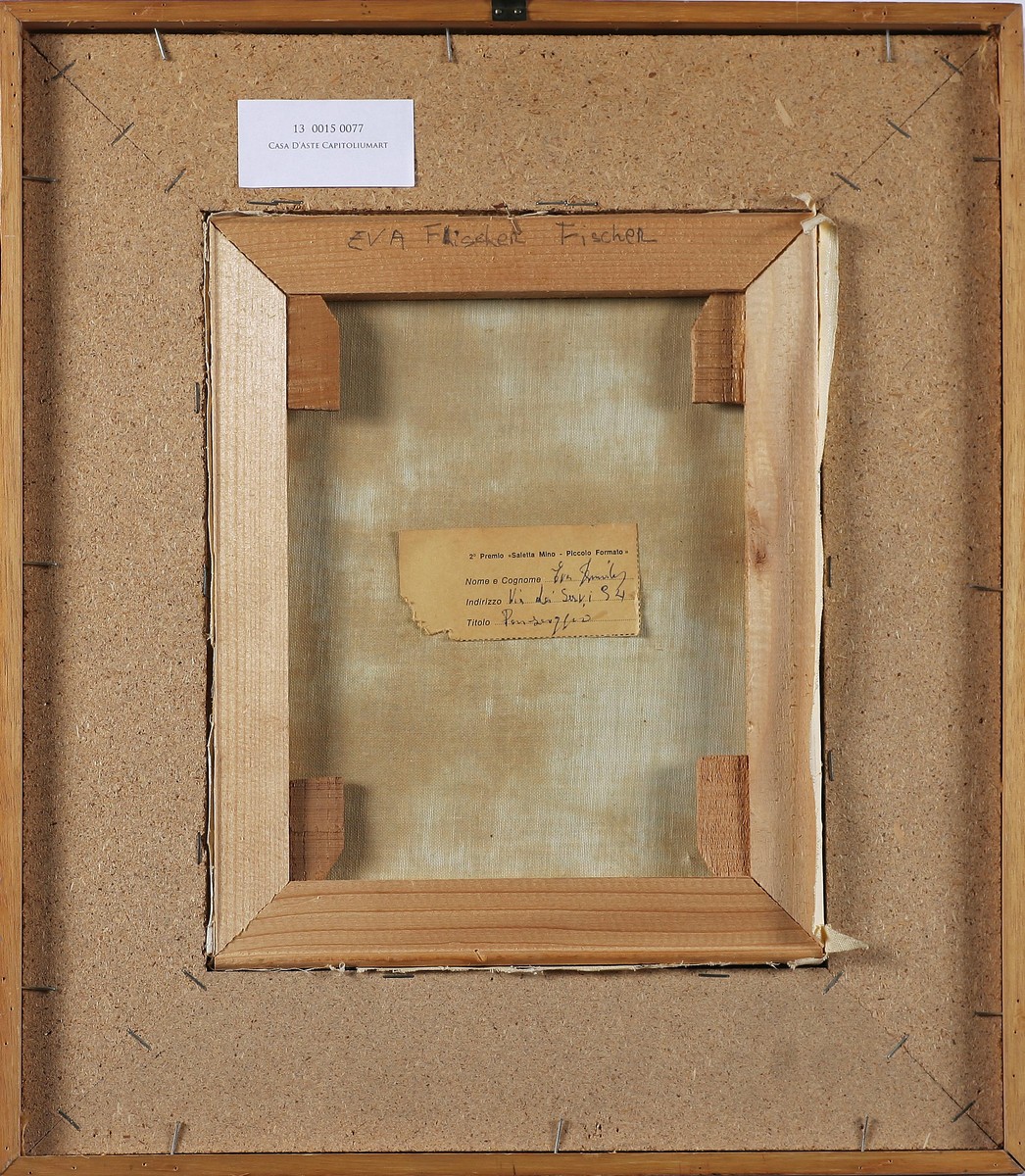 FISCHER EVA (n. 1920) Paesaggio. Olio su tela. Cm 24,50 x 30,50. Al retro cartiglio descrittivo riguardante il secondo premio "Saletta Mino - Piccolo Formato" ricevuto dall'opera, firma in basso a destra. Cornice presente