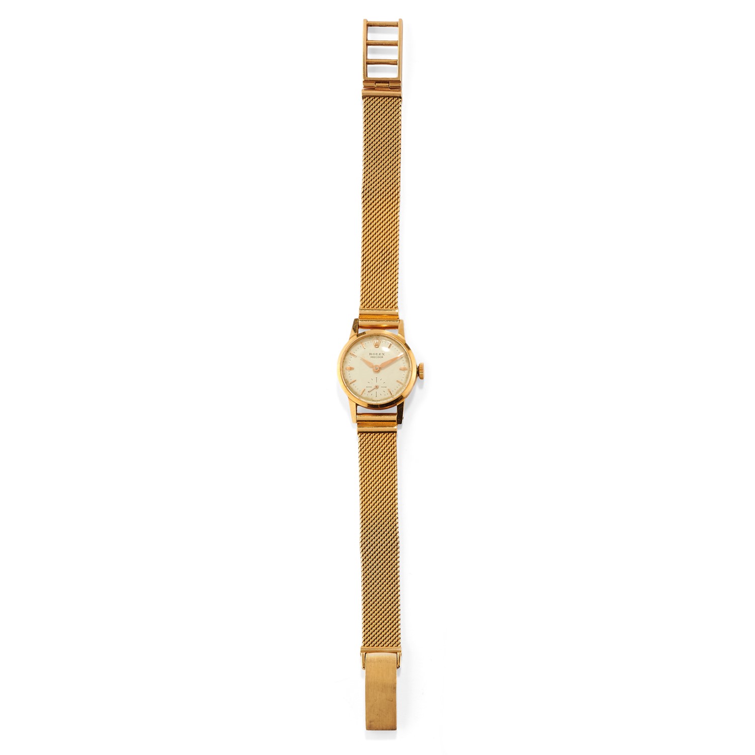 ref. 8854, cassa rotonda, quadrante chiaro con indici applicati, movimento a carica manuale, bracciale in oro 18K non originale.