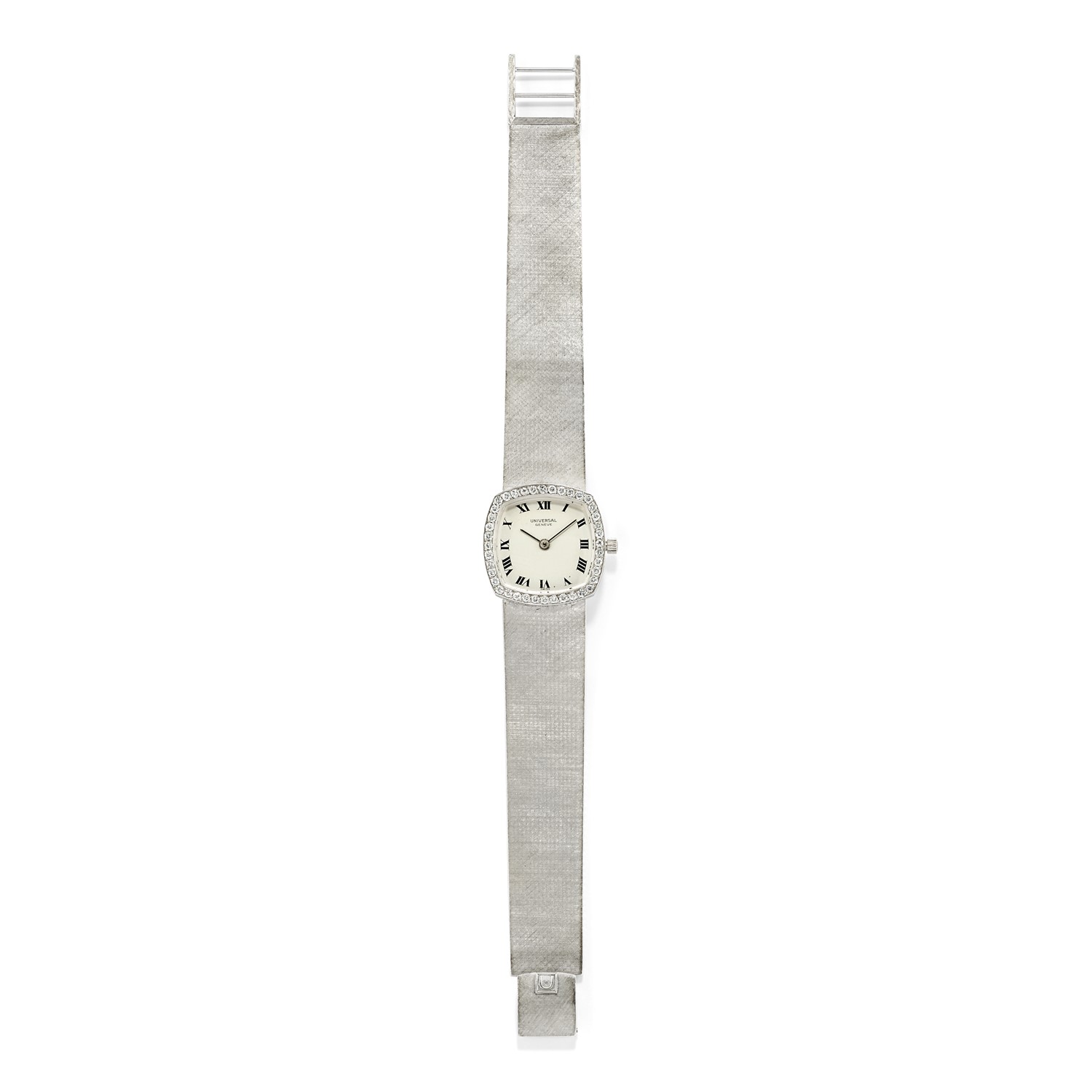 cassa rettangolare con bordi arrotondati, lunetta in diamanti taglio brillante, quadrante chiaro con numeri romani in smalto nero, movimento a carica manuale.