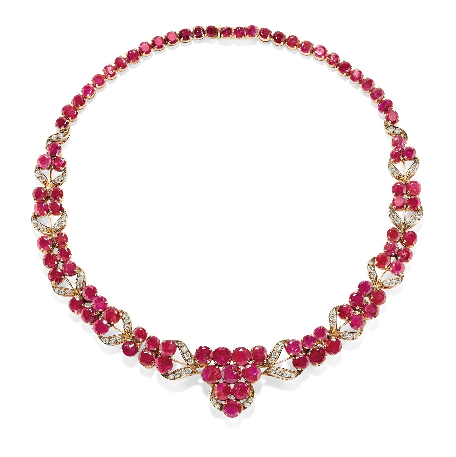 in argento, oro giallo 18K, diamanti taglio brillante, rubini taglio rotondo e ovale per totale ct 70,00 circa.