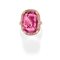 in oro giallo 18K, al centro uno spinello purplish pink taglio rettangolare arrotondato di ct 17,50 e diamanti taglio brillante a decoro.