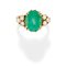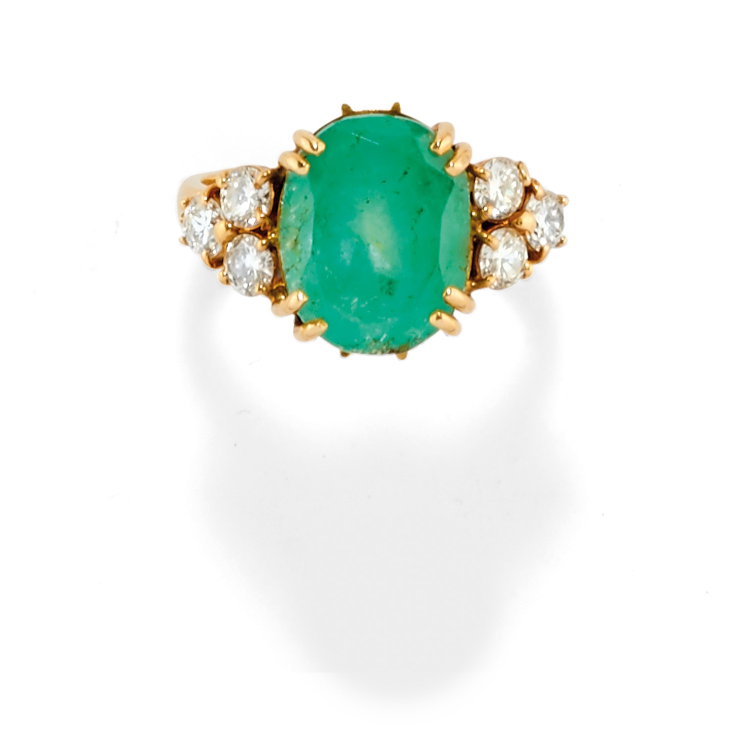 in oro giallo 18K, smeraldo taglio ovale di ct 6,30 circa e diamanti taglio brillante per totale ct 0,80 circa.