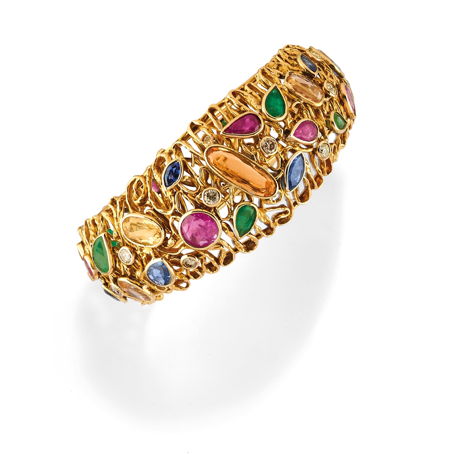 Bracciale rigido con smeraldi, rubini, zaffiri e pietre colorate e diamanti
