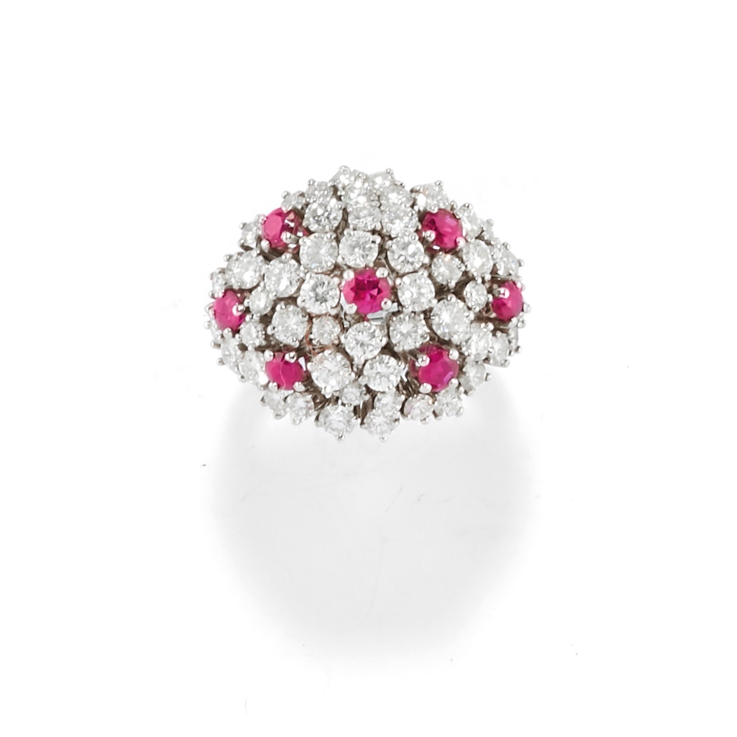 in platino, rubini taglio rotondo per totale ct 0,70 circa e diamanti taglio brillante per totale ct 2,00 circa.