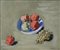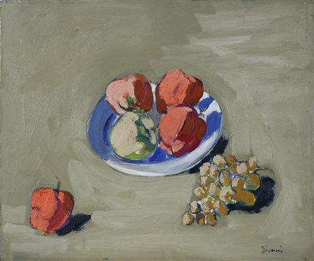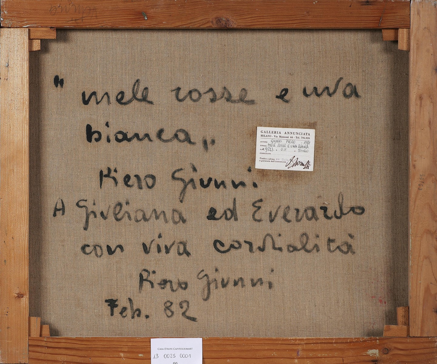 GIUNNI PIERO (1912 - 2000) Mele rosse e uva bianca. 1978. Olio su tela . Cm 60,00 x 50,00. Al retro firma, titolo, dedica e cartiglio descrittivo della Galleria Annunciata, Milano. Firma in basso a destra.