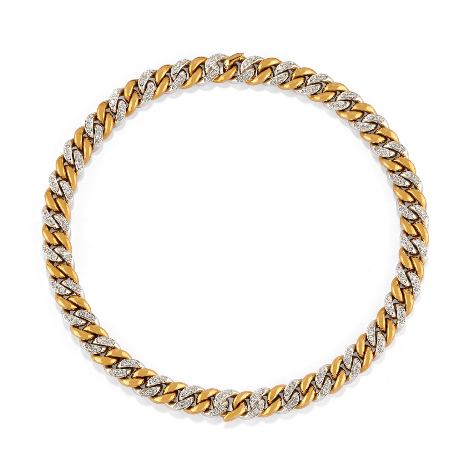 in oro bicolore 18K e diamanti taglio brillante per totale ct 3,00 circa, maglia groumette, indossabile anche come due bracciali.