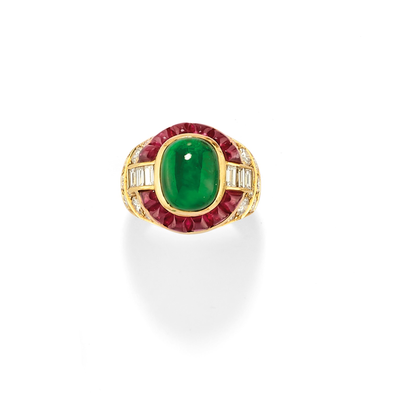 in oro giallo 18K, rubini taglio cabochon, smeraldo taglio cabochon di ct 3,70 circa, diamanti taglio brillante e baguette per totale ct 2,00 circa.