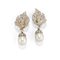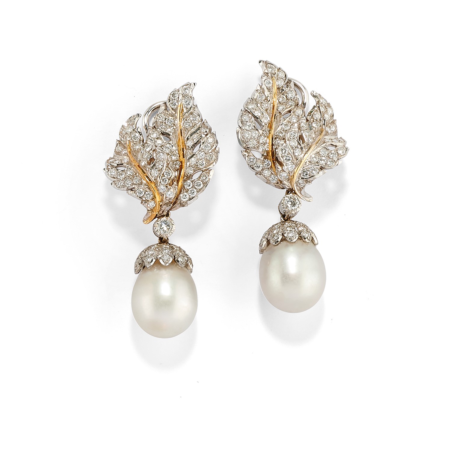 in oro bicolore 18K, realizzati a tre foglie impreziosite da diamanti taglio brillante e due perle coltivate, estraibili, diametro da mm 12,10/12,30 e con un'altezza di mm 15,80/16,30, entro astuccio.