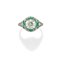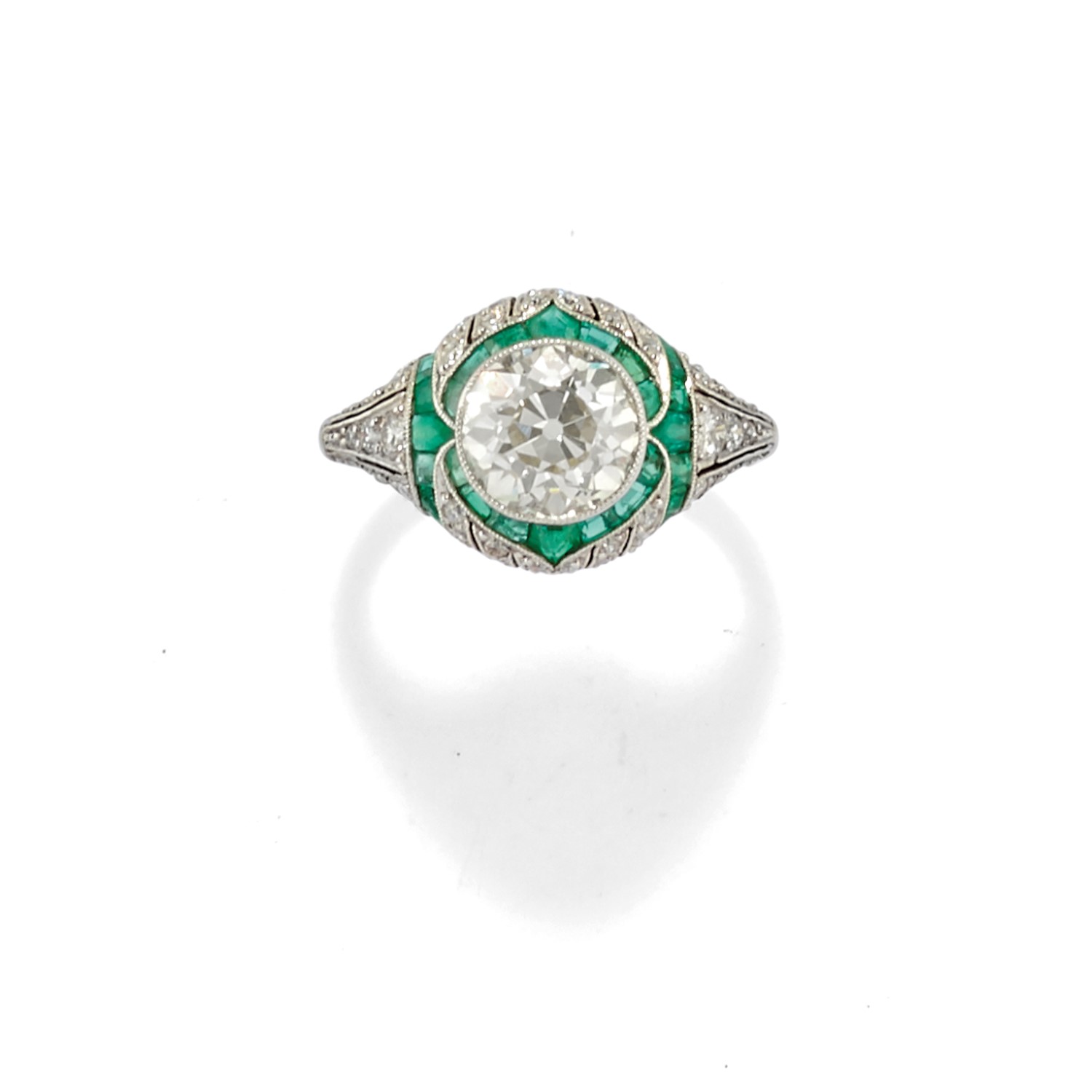 in platino, al centro diamante taglio vecchio di ct 2,30 (caratura incisa), prob. colore L/M, purezza VS, smeraldi taglio carré e fantasia, diamanti taglio vecchio, huit-huit e brillante a decoro della montatura, lavorazione a milligrano.