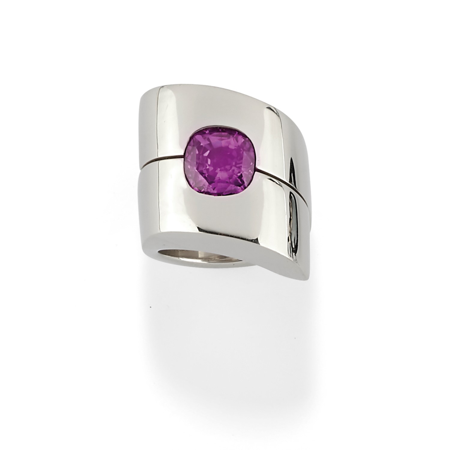 in platino e zaffiro rosa taglio cuscino di ct 3,00 circa, collezione speciale.
