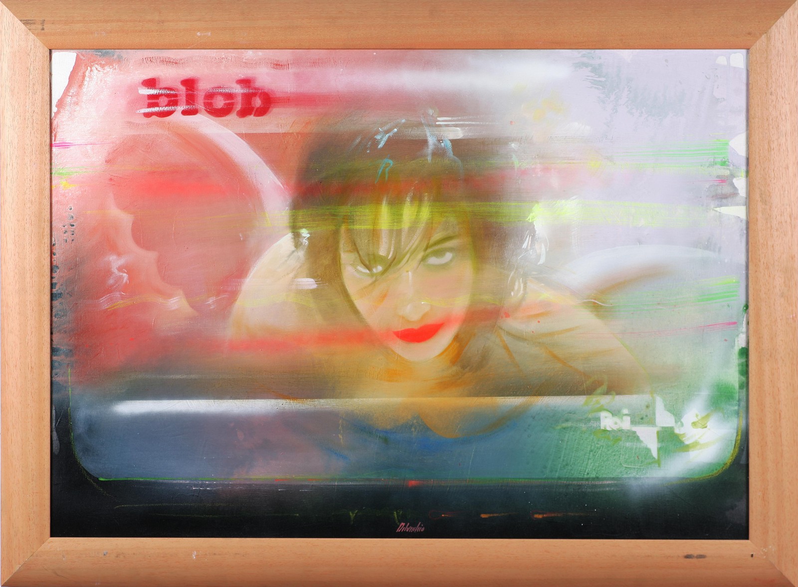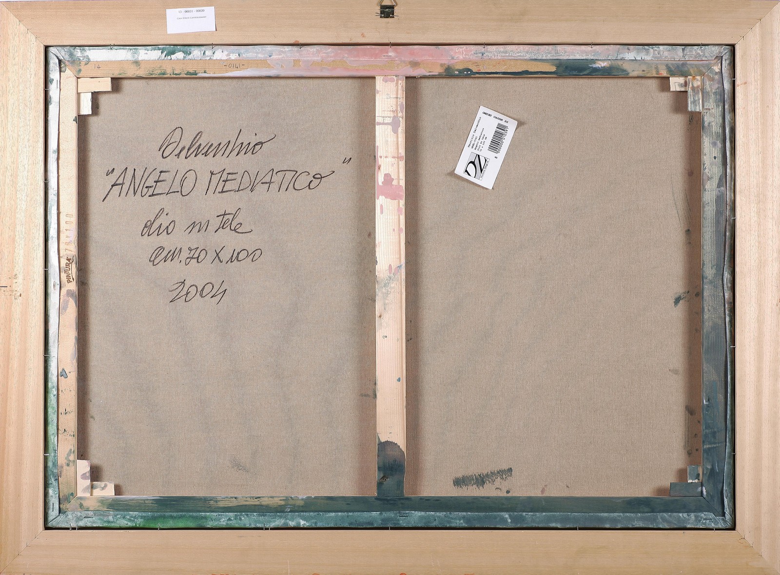 DEL VECCHIO MAURIZIO (n. 1962) Angelo mediatico. 2004. Olio su tela . Cm 100,00 x 70,00. Firma in basso al centro. Al retro firma titolo e anno. Autentica dell'artista su fotografia. Cornice presente
