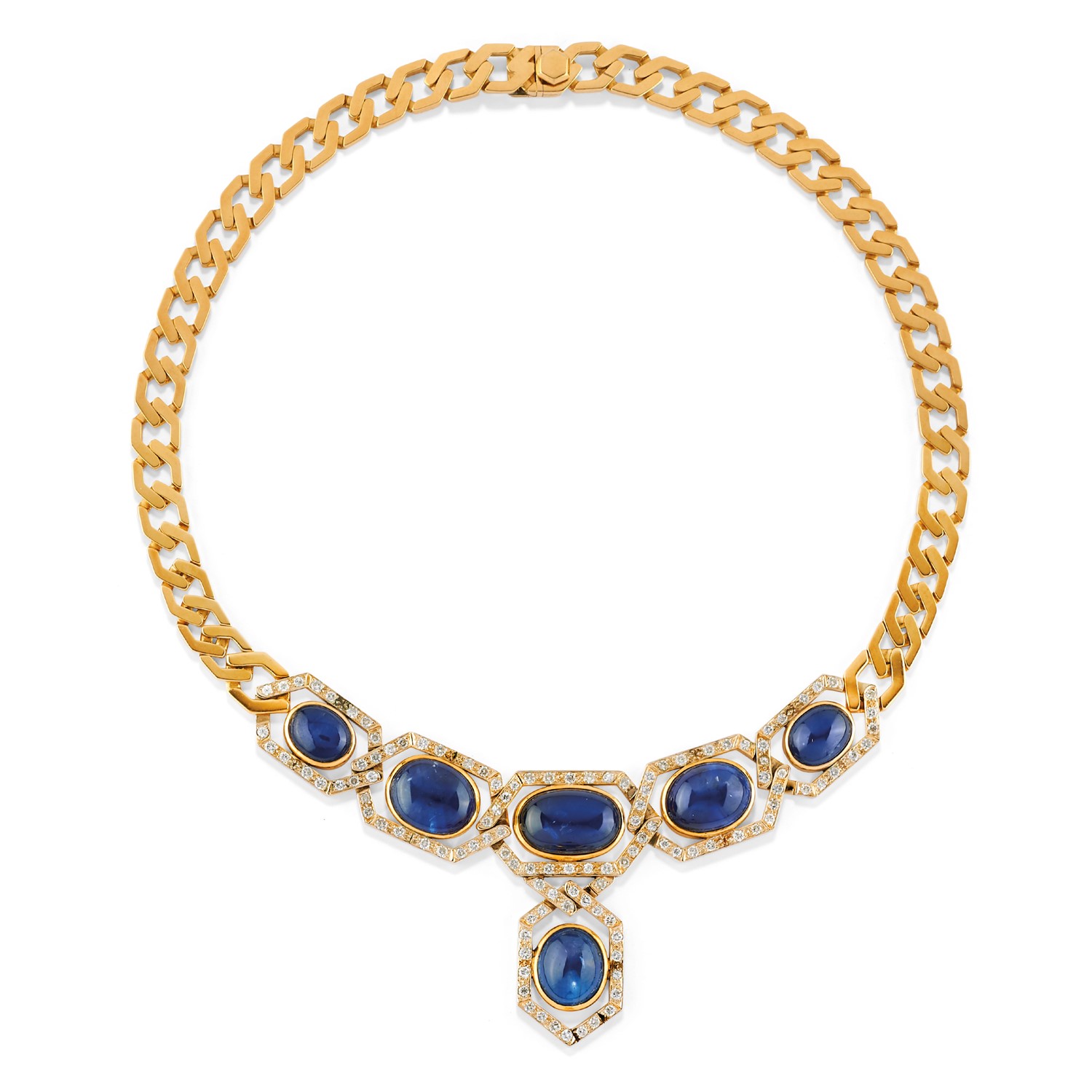 in oro bicolore 18K, maglia a catena con inserti in zaffiri taglio cabochon per totale ct 50,00 circa e diamanti taglio brillante per totale ct 2,00 circa.