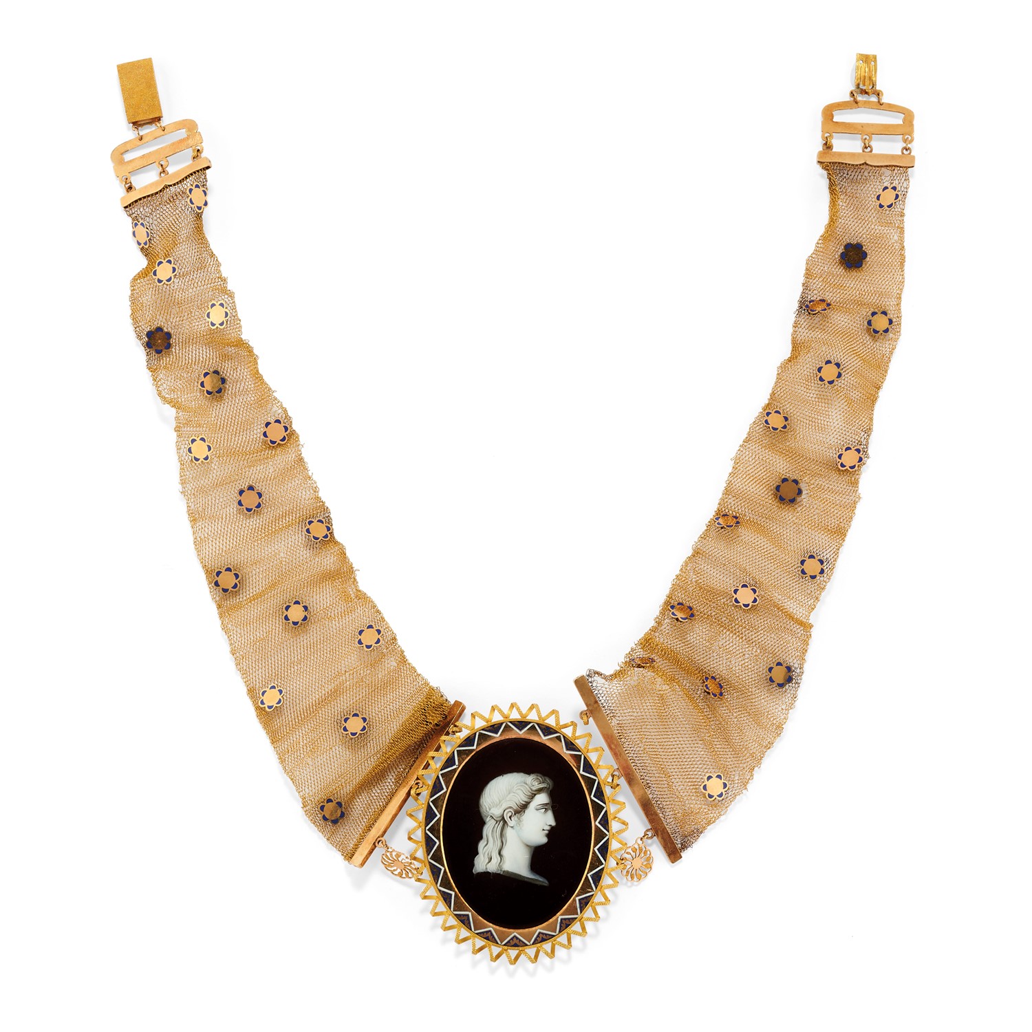 in oro giallo 18K, maglia a tessuto con inserti a fiori in smalto blu e centrale raffigurante profilo maschile.
