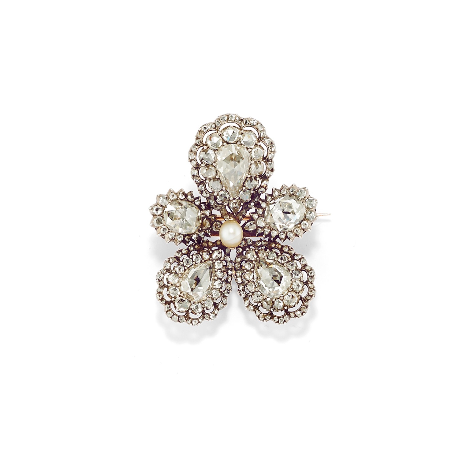 in argento e oro giallo 18K, realizzata a fiore con diamanti di forma rotonda, ovale e pera taglio rosa e al centro perla (prob. naturale).