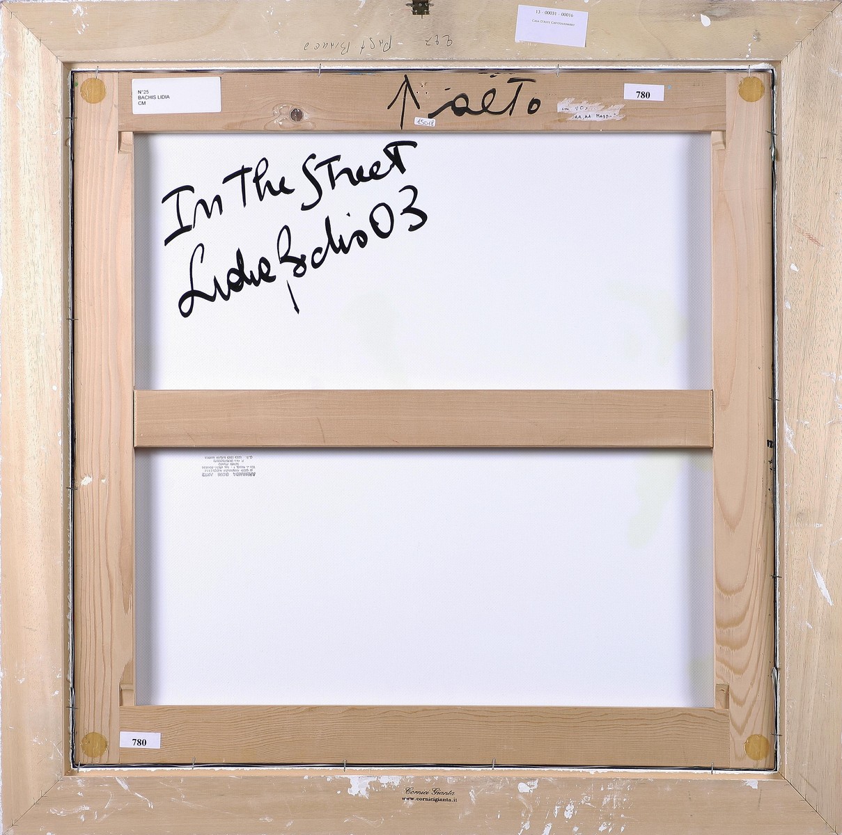 BACHIS LIDIA (n. 1969) In the street. 2003. Olio su tela emulsionata. Cm 70,00 x 70,00. Al retro titolo, firma e anno. Cornice presente