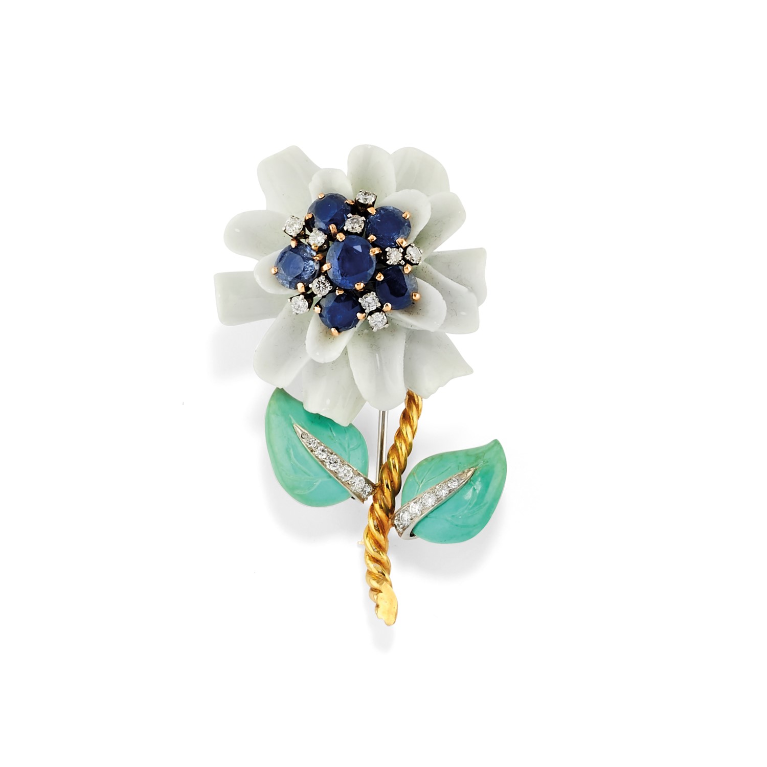 Spilla con ceramica bianca, zaffiri, turchese e diamanti