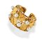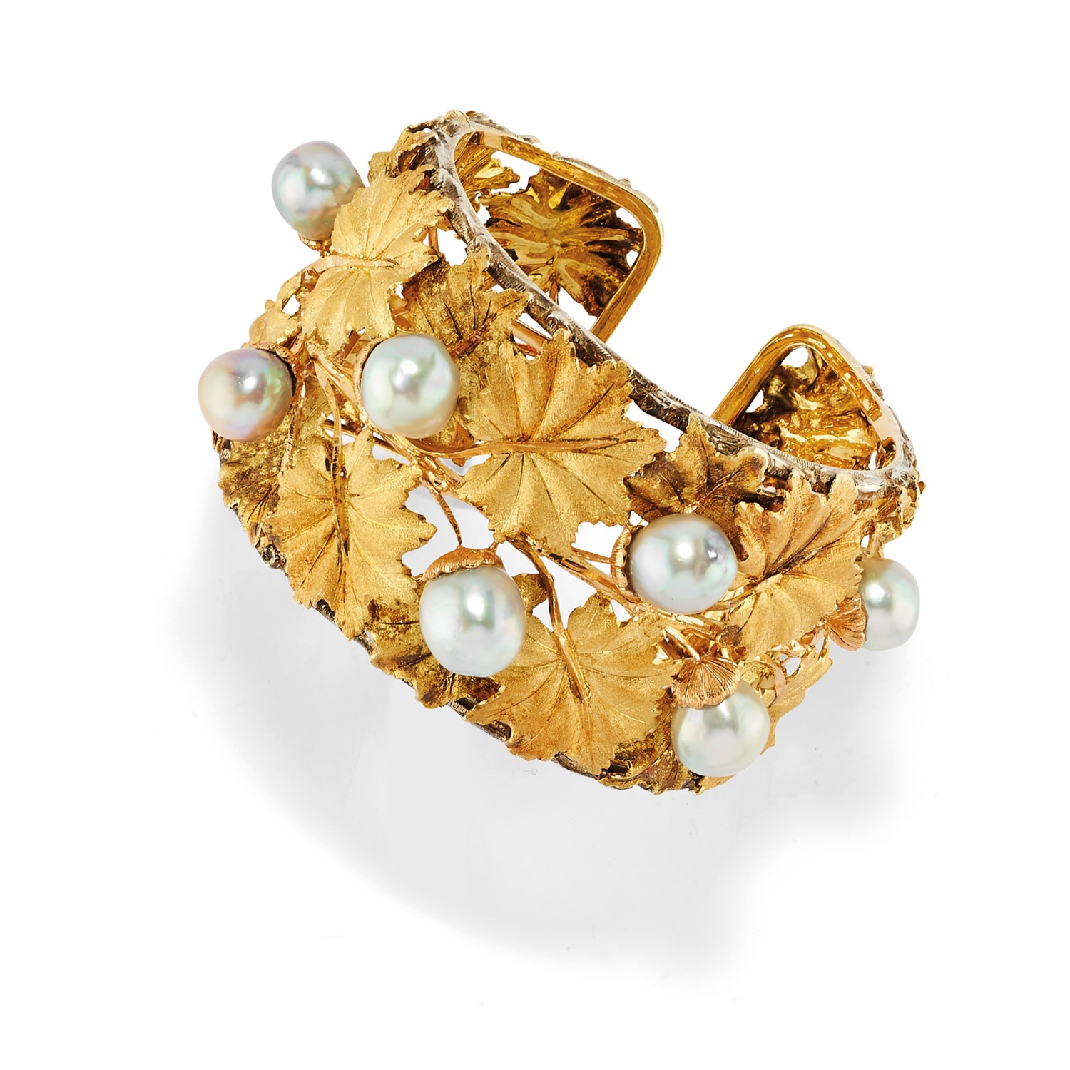 in oro bicolore 18K, con motivi a foglie incise e perle coltivate di diametro mm 10,00 circa, reca firma M. Buccellati.