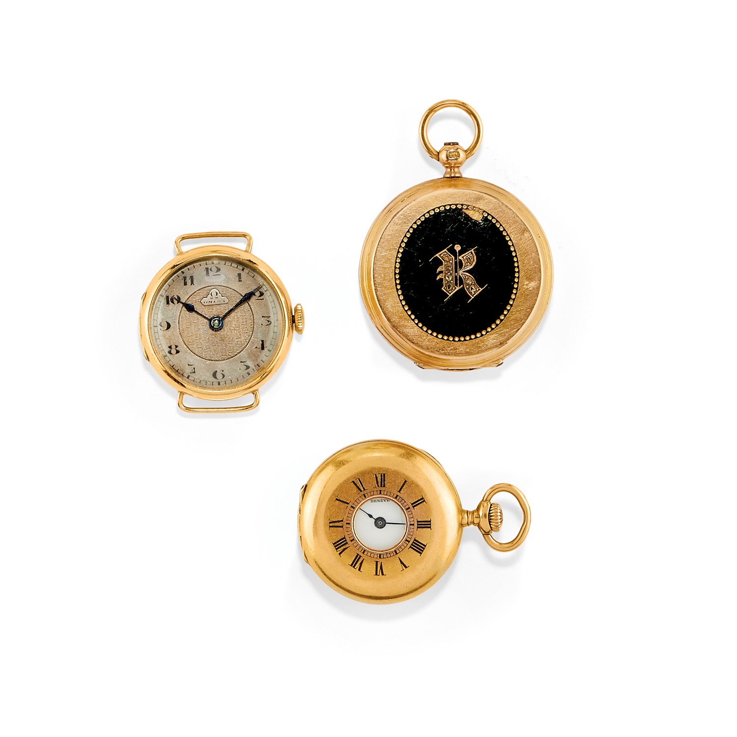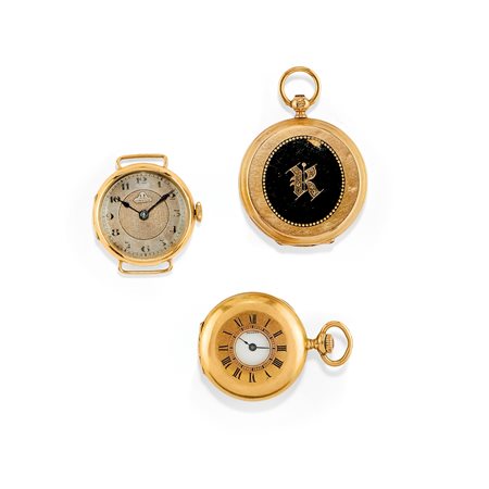 in oro giallo 18K, due da tasca e uno da polso, difetti (mancanza di smalto).