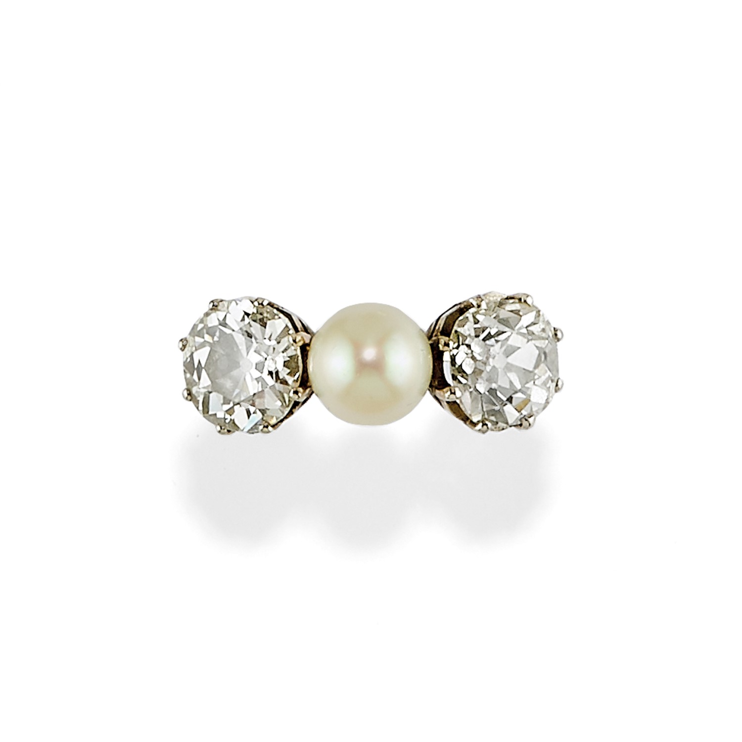 in platino, perla coltivata e due diamanti taglio vecchio per totale ct 5,00 circa.