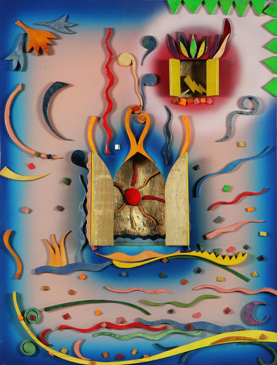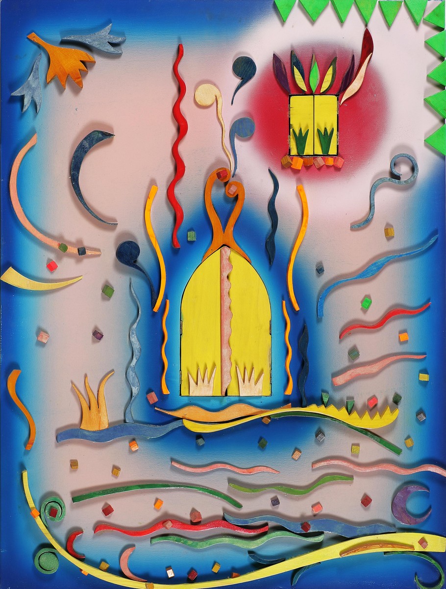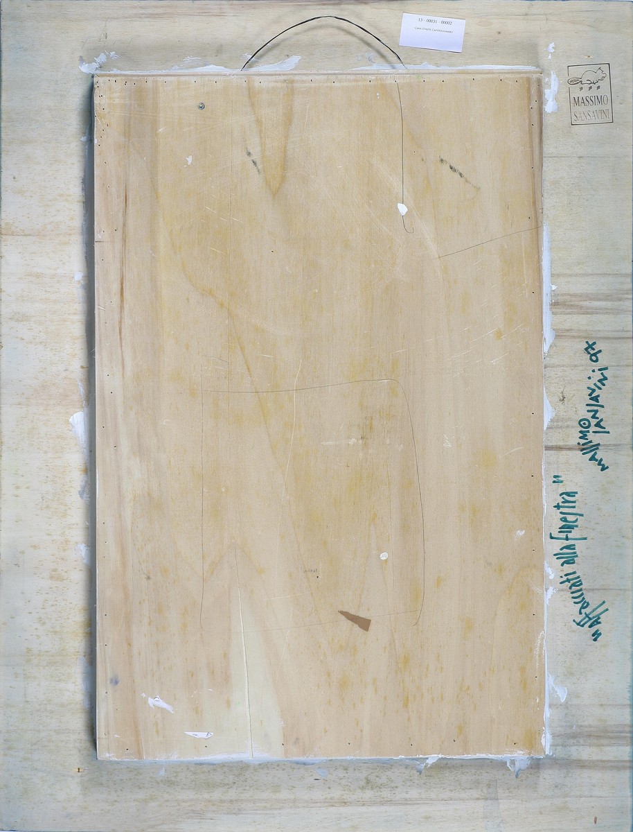 SANSAVINI MASSIMO (n. 1961) Affacciati alla finestra. 1997. Tecnica mista su tavola. Cm 70,00 x 92,00. Al retro firma, titolo e anno. Autentica dell'artista su fotografia. Opera pubblicata sul catalogo (allegato all'opera) - Massimo Sansavini - a cura di Monte Titano Arte, San Marino.