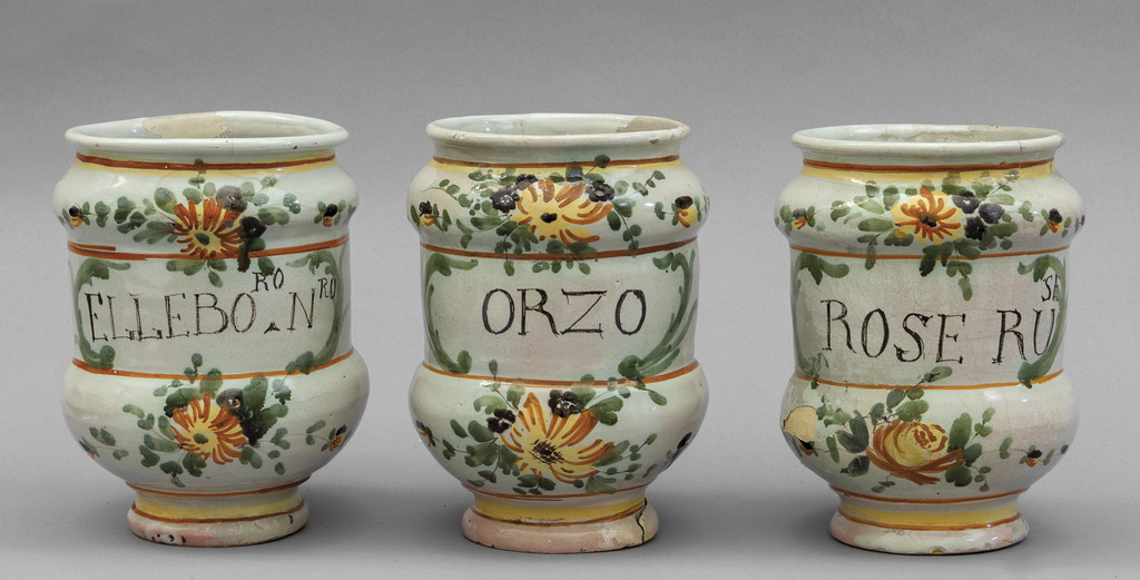 99 - Tre grandi albarelli in ceramica, decorazione verde e giallo su fondo bianco, Orzo, Ellebo e Rosa, Torino sec.XVIII