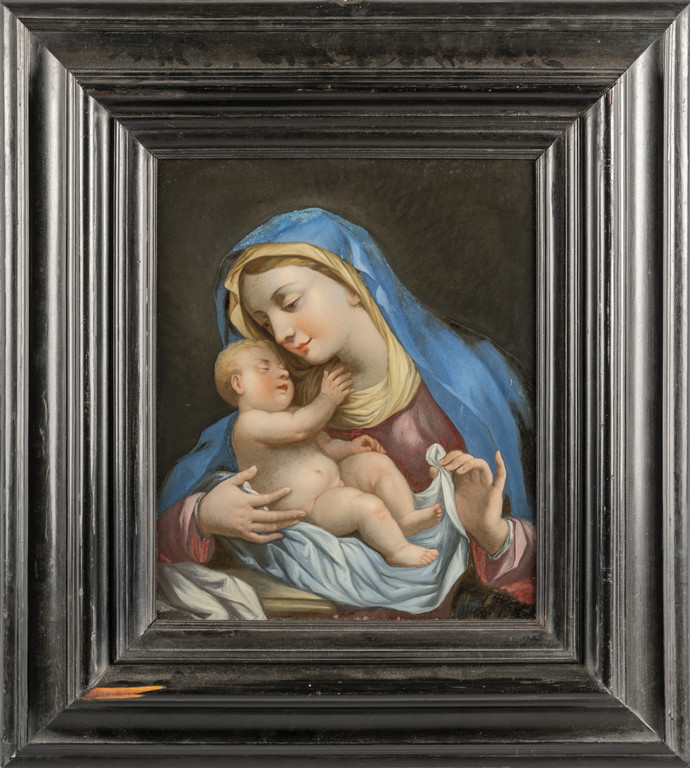 Scuola napoletana "Madonna con Bambino" olio su vetro, fine sec.XVII inizi sec.XVIII cornice coeva in legno ebanizzato