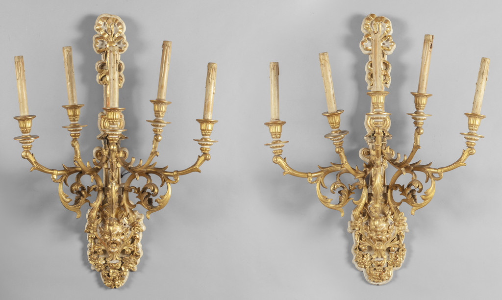Coppia di grandi bracci a cinque luci in legno finemente intagliato, dorato e laccato, sec.XIX